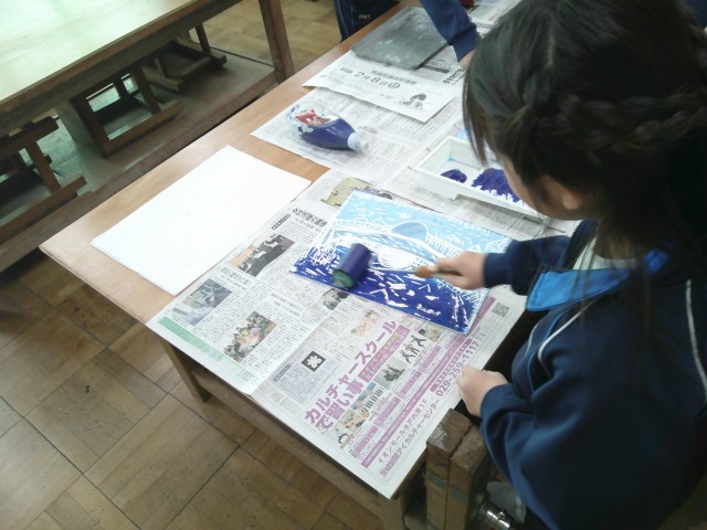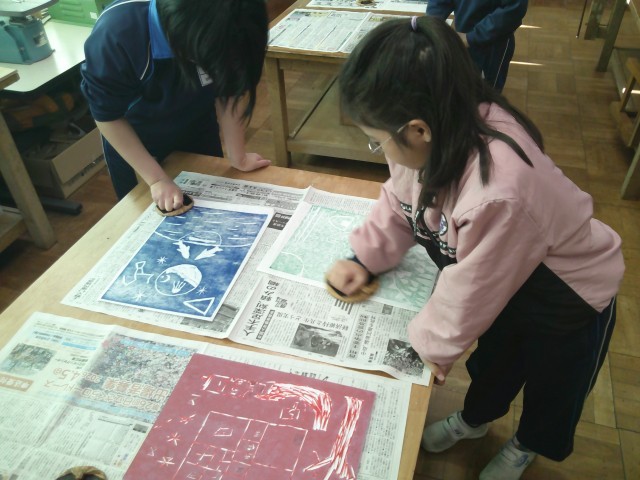 4年生の図工では、彫刻刀で線を彫り版画を行いました。