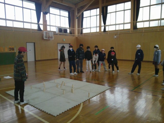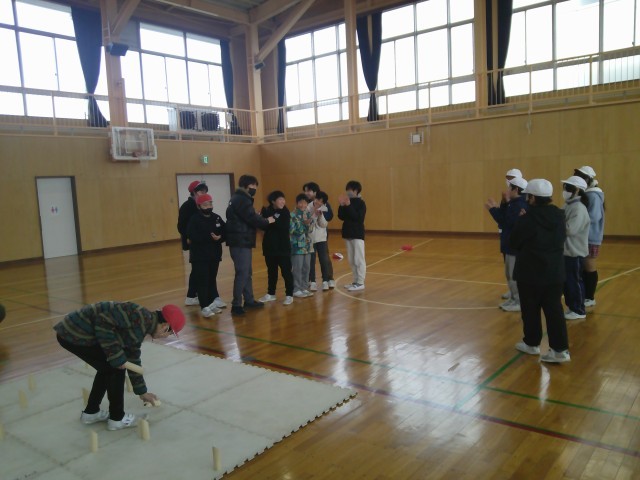 総合の授業では、国際理解を深めるために、モルックを行いました。