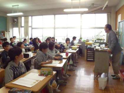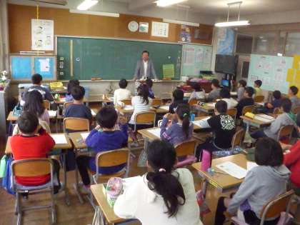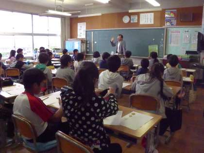 5年生の総合的な学習の時間では,「六郷米をつくろう」をテーマに一人一人課題を考えて調べていきます。今日は,学習ボランティアの方に来ていただき,お米についてお話をしてもらいました。お米の種類はいくつあるのか?お米はどのように使われているのか?等。子どもたちにとってお米は,おにぎりやお寿司を食べる等で,加工されたもはあまり知らないようです。お米からお酒や醤油ができたり,米粉となってパンやうどんになったりすることは,あまり知らなかったようです。このようにして,子どもたちは自分で課題を見つけ,お米について調べます。総合的な学習では,自ら課題を見付け,自ら学び,自ら考え,主体的に判断し,よりよく問題を解決する資質や能力を育てることなどをねらいとしています。