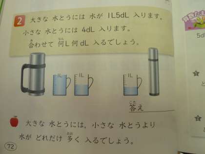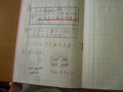 今日は,「水のかさを調べよう。」の単元で,1L5dLと4dLを合わせる学習をしました。LとdLを分けてたしたり,図にかいて考えたり,いろいろな方法を学ぶことができました。