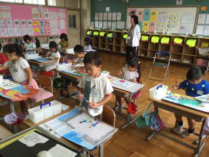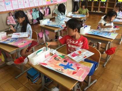 図工「せんせいあのね」では、1学期にがんばったことをクレパスで描いて、絵の具で色を塗って仕上げました。絵の具は今日で2回目ですが、絵の具の用意の仕方、絵の具の溶き方、塗り方、片付けまで上手にできました。