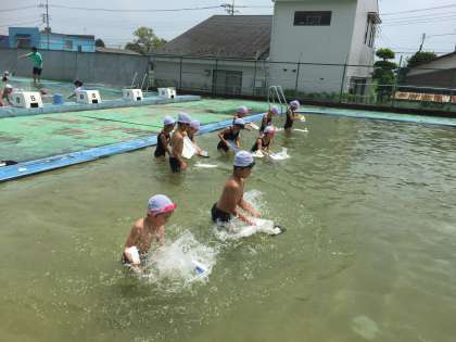 1年 水泳学習 公開日 2016/07/15 更新日 2016/07/15 1年生 今日は、最後の水泳学習でした。最初に水泳検定をしました。水泳学習を始めた頃よりも、だいぶ水に慣れたようで、水の中にもぐったり、け伸びをしたり、ばた足をしたりするのがとても上手になりました。水泳検定の後は、生活科で作った帆かけ船や水鉄砲で遊びました。とても楽しかったようで、家に持ち帰ってお風呂で遊びたいと話していました。