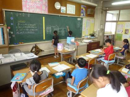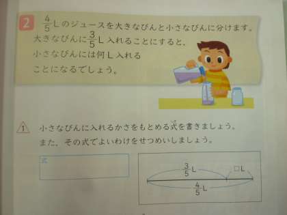 今日は,「分数のひき算」について学習しました。分母の等しい分数のひき算はたいへんよくできています。しかし,1ひく3分の2のような1が絡むひき算になると難しいようです。1は分母と分子が同数になるということをしっかりおさえる必要があります。