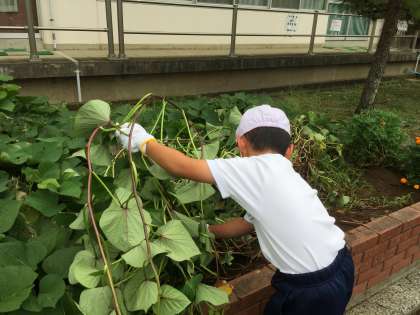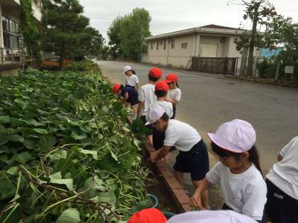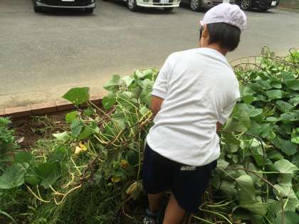 さつまいものつるが、畑をこえてぐんぐん伸びているので、つるがえしをしました。美味しくて、大きいさつまいもができるといいね〜〜と話しながら、みんな頑張っていました。