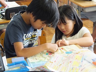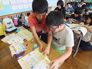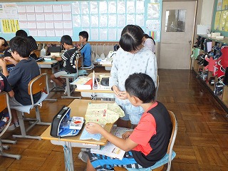 家庭科でボタン付けをしました 公開日 2016/09/16 更新日 2016/09/16 5年生 本日の家庭科では,ボタン付けの練習をしました。教科書を見ながら,自分の力でどれぐらいできるか様子を見ていたら,自然に,早く仕上がった児童が手こずっている児童に声をかけ,上手に助言をしていました。特に技能教科においては,やや時間がかかっても,こどもたち同士で考えたり,教え合ったりすることが有意義かなと感じました。