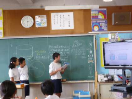 算数 公開日 2016/09/16 更新日 2016/09/16 6年生 円柱の体積の求め方をグループで考え,それぞれのグループで円柱の体積の求め方を発表しました。友だちに体積の求め方を分かりやすく説明することができました。