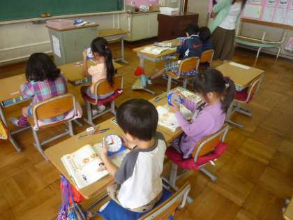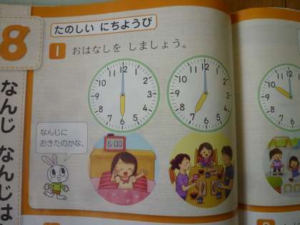 今日から時計の勉強が始まりました。「なんじ,なんじはん」の読み方を学習しました。ご家庭におかれましても,時計を読ませる習慣をつけさせていただけるようよろしくお願いします。