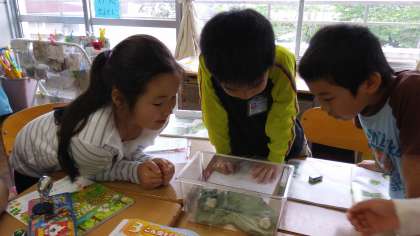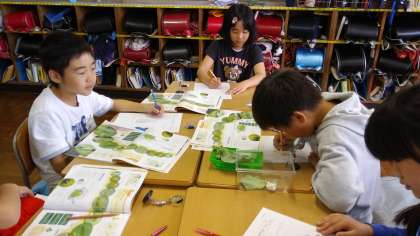 幼虫とたまごを観察しました。 キャベツを交換してフンも取り除き、かごの中をきれいにしました。