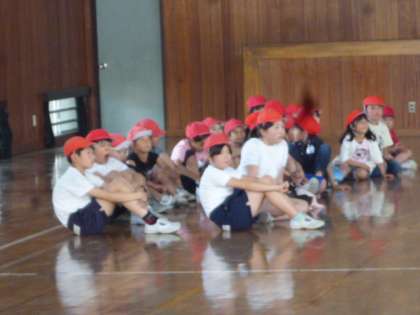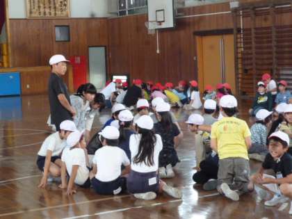 今日から運動会の全校リレーの練習が始まりました。昼休み,全校児童が体育館に集まり,6年生が中心となり走る順番を決めました。