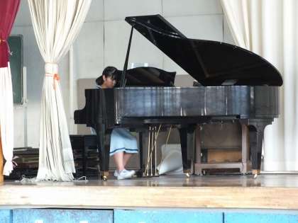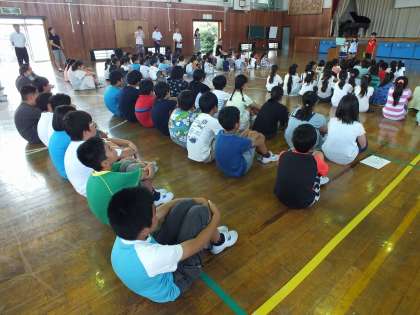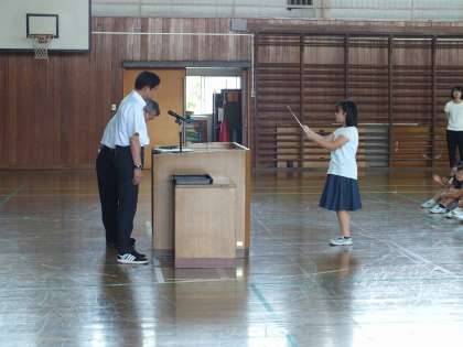 1学期終業式 公開日 2017/07/20 更新日 2017/07/20 6年生 本日で1学期が終了,4校時に終業式を行いました。式の前に,「みんなにすすめたい一冊の本 教育長賞」の表彰があり,6年生が代表で賞状をいただきました。校長先生の式辞では,6年生の活躍についてお褒めの言葉があり,思わずにっこりの6年生。校歌斉唱の伴奏も,6年生が行いました。なお,これから体育館の改築が行われるため現在の体育館での学校行事は,本日が最後になるようです。