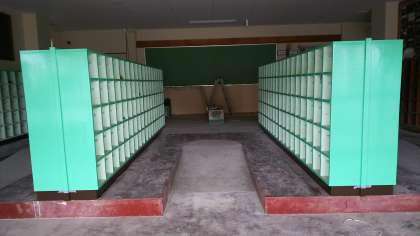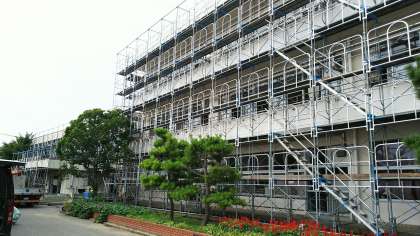 校舎も体育館も足場が組まれ、工事が進んでいます。昇降口が明るくきれいになりました。