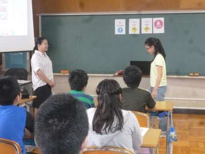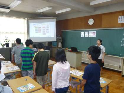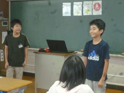 外国語の学習から 公開日 2017/09/01 更新日 2017/09/01 6年生 本日の外国語では,道案内の仕方を学習しました。"go straight""turn left""turn right"の言い方を,実際に体の向きを変えて練習しました。