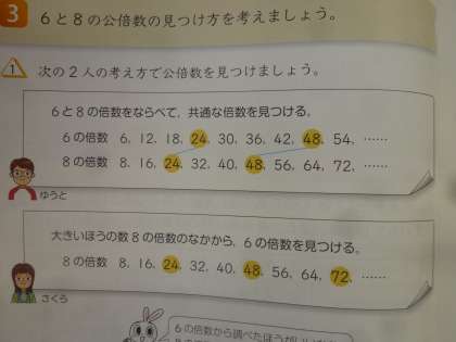 今日は,6と8の公倍数の見つけ方について学習しました。ポイントは,公倍数を見つけるときは,大きい方の数の倍数のなかから小さい方の数の倍数を見つけるとはやいという点です。多くの練習問題に取り組みましょう。