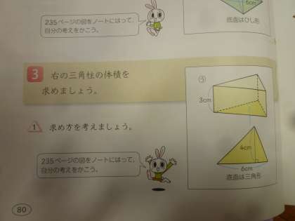 今日は,三角柱の体積の求め方について学習しました。ポイントは,三角柱も四角柱と同様,底面積×高さで求められるという点です。多くの練習問題に取り組みましょう。