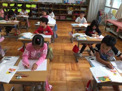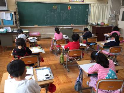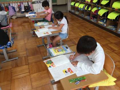1年 国語 公開日 2017/10/06 更新日 2017/10/06 1年生 国語の時間は、「ぼく・わたしの『とくせいサラダ』でげんき」の本作りをしています。今日は、となりの犬がやって来る場面を読み取って、プリントにまとめました。明日は、すずめの場面です。最後には、自分で、出てくる動物を考えて、本を仕上げていきます。