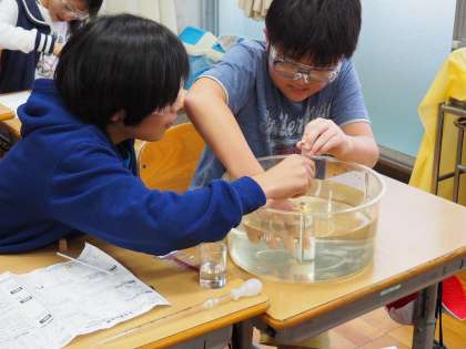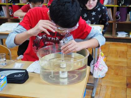 水溶液の性質1 公開日 2017/10/06 更新日 2017/10/06 6年生 本日の理科では,発展の学習として塩酸で銅板,亜鉛板が溶けるかを確かめました。もう一つの実験は,小さい石灰石に薄い塩酸をかけて二酸化炭素を発生させ,それを水に溶かして炭酸水を作りました。