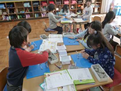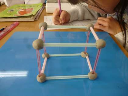 2年 算数 公開日 2018/02/06 更新日 2018/02/06 2年生 箱の形の学習をしています。今日は、ストローと粘土玉を使って箱の形を作りました。辺は12本、頂点は8個ということを学びました。