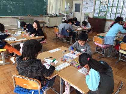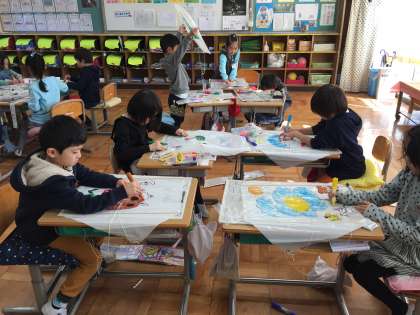 1年 図工 公開日 2018/02/06 更新日 2018/02/06 1年生 図工の時間は、「ゆめあかり3.11」に取り組みました。「えがおでがんばって」「みらいをしんじて」などのメッセージや絵を描いて仕上げました。その後は、たこ作りをしました。たこあげをするのが楽しみです。