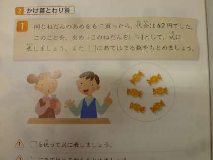 算数の学習のポイント(3年) 公開日 2018/02/07 更新日 2018/02/07 3年生 2月7日(水) 今日は,□を使ったかけ算の式について学習しました。□×6=42,ポイントは全部の数42をいくつ分6で割る点です。