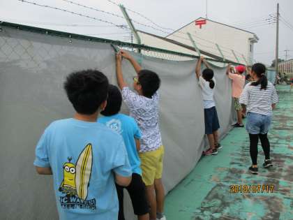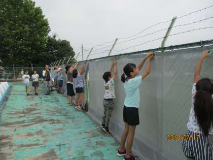 高学年の子供たちと教員で、プールフェンスに設置した目隠し用のネットをはずす作業をしました。