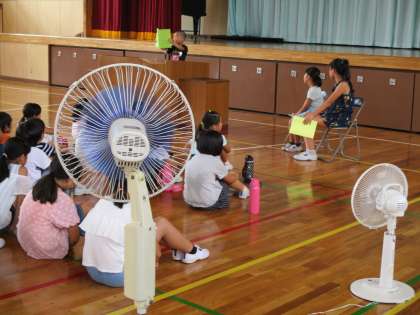 体育館の全ての窓を開けて風を通し、併せて学校中の扇風機を集めて使用しました。