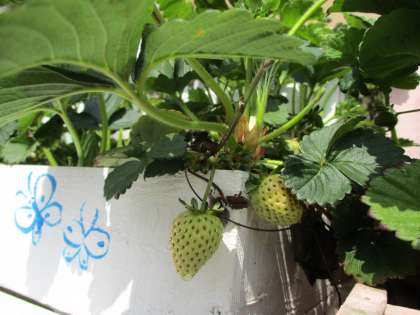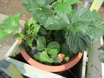 昇降口前のイチゴ畑で,小さなイチゴがなり始めました。花もかわいいのですが,だんだんと赤くなる実が本当にかわいらしいです。お日様となかよくして,甘いイチゴになってね!