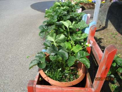 余談が長くなってしまいましたが、イチゴに水をあげていたら、プランターの後ろにも、なんと、可愛いいちごが育っているではありませんか。日当たりが悪くても、温度が高くなると種は発芽し、芽が伸びて、立派に実を付けるのですね。