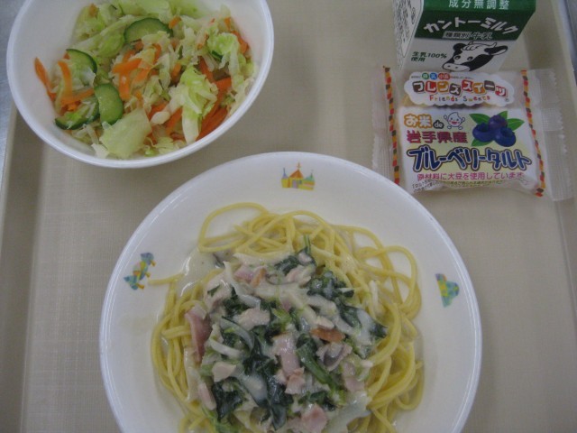 献立名 チキンクリームスパゲティ 牛乳 キャベツサラダ ブルーベリータルト
