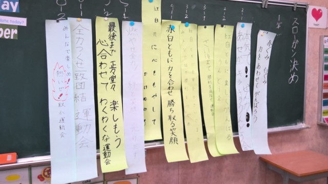 運動会まであと1週間となりました。取手小のみんなで一致団結し、全員がわくわく楽しく頑張れる運動会になるようにと、企画集会委員が中心となり、各クラスで知恵と思いを出し合い、スローガンを考えました。