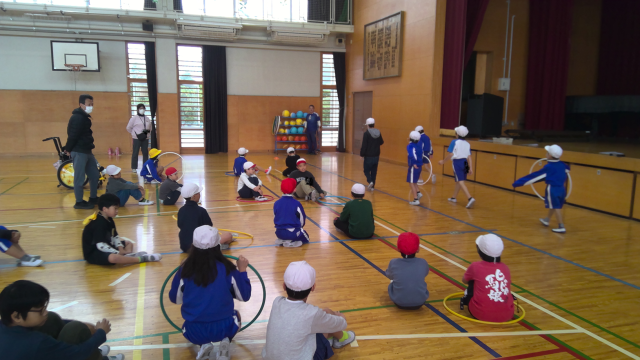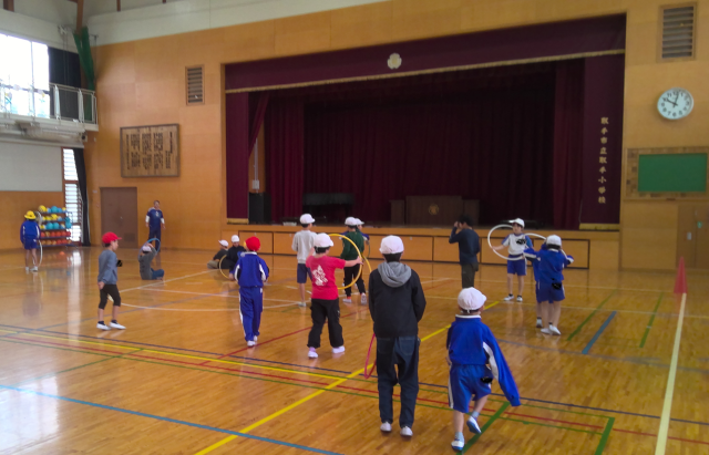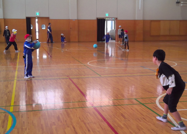 フラフープやボール運動では、ペアになって楽しみました。