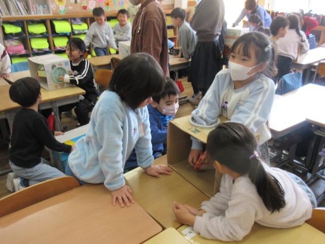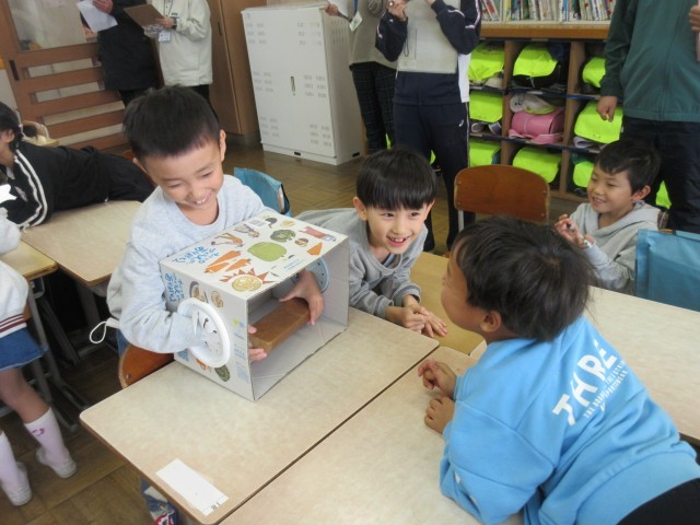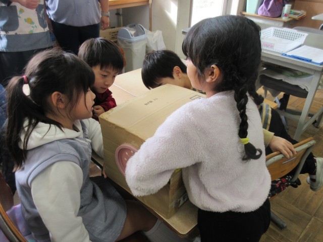 いろいろな箱を使って、形の種類を学習しました。グループで段ボールの中に隠されている箱の形を当てるゲームをして、形の特徴を覚えました。