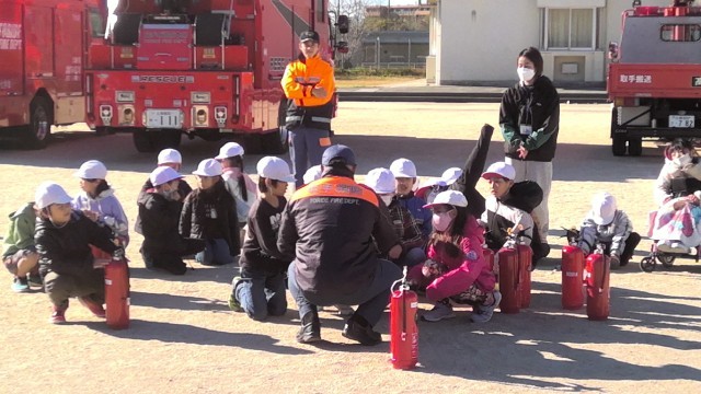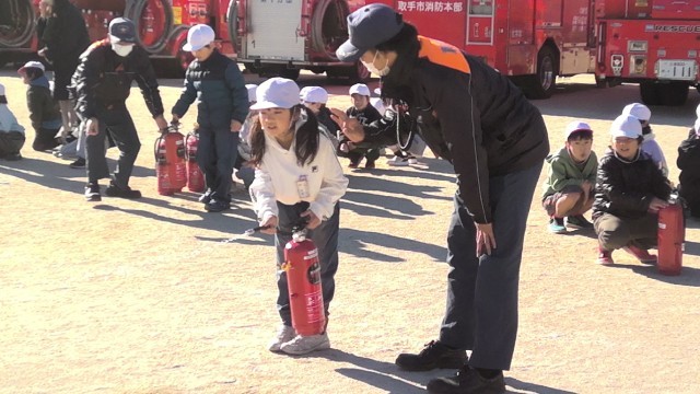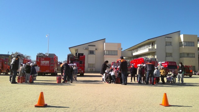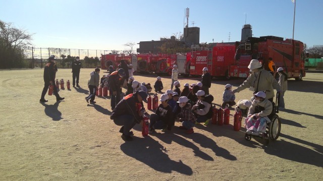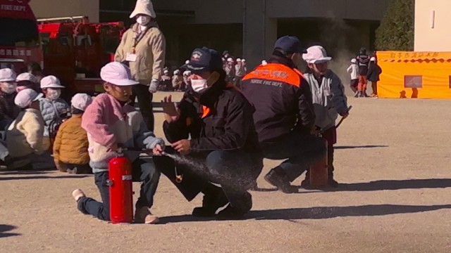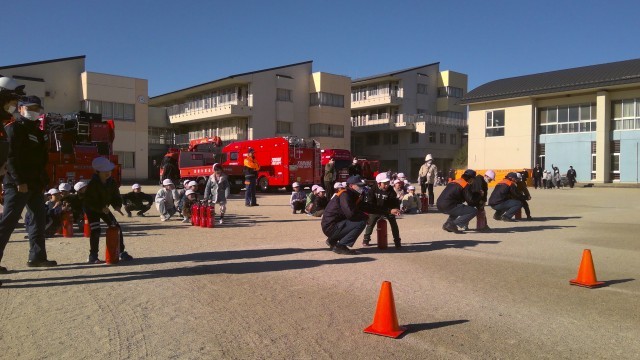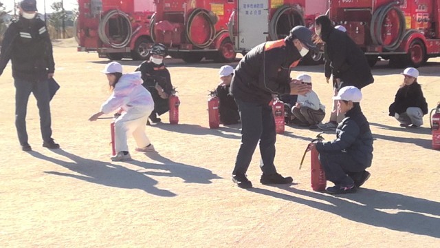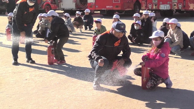 第1部は、校庭に出て消火訓練を行いました。実際に消火器を使って消火活動を体験しました。真剣に取り組むことができました。