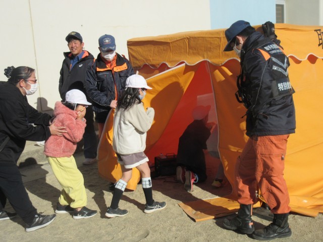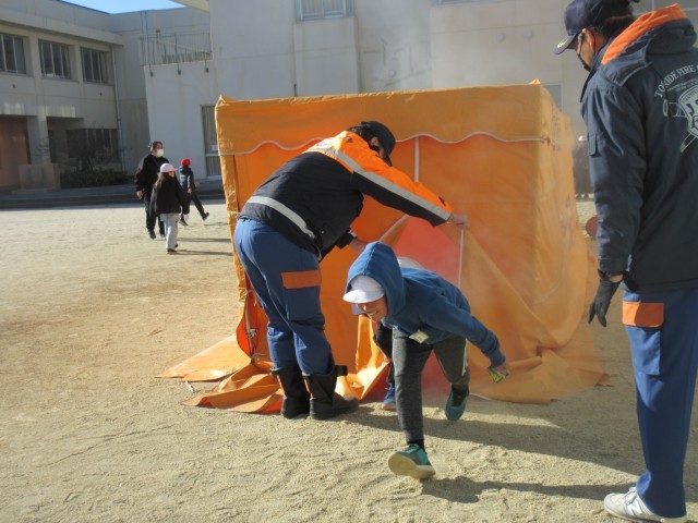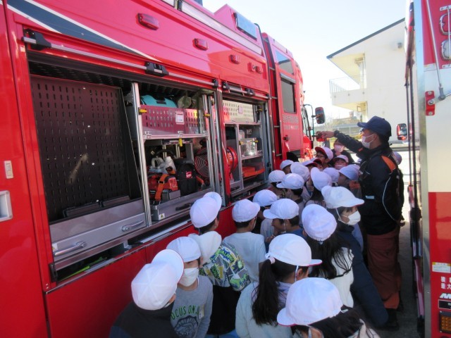 3年生は、煙体験をしました。煙の中、避難しなければならない場面は起きてほしくないですが、もしそのようなことが起きたときには、煙体験で学んだことを思い出してくれるとよいと思います。また、その後は、消防車の見学をしました。強風の中の活動でしたが、みんな真剣に取り組みました。