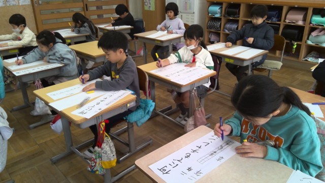 書き初めにチャレンジしました。字の大きさや形に気を付けながら、一文字一文字心を込めて丁寧に書き上げました。