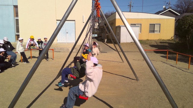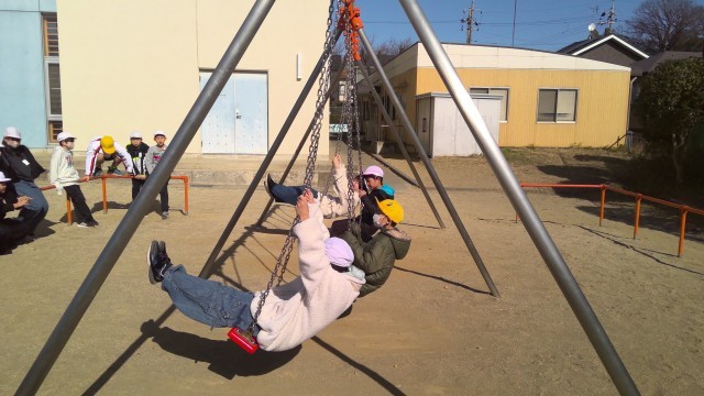 という子供たちの疑問から、外に出てブランコに乗りました。