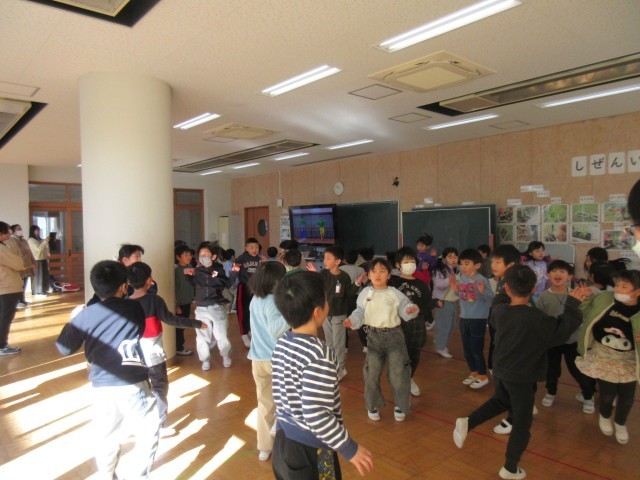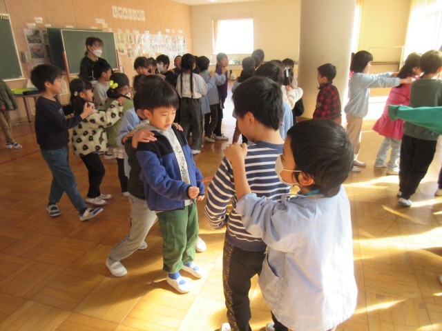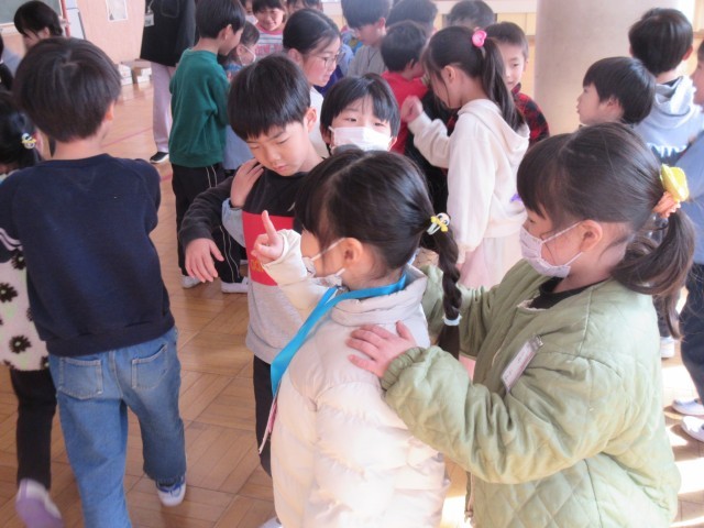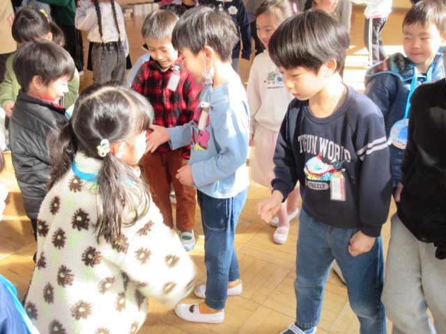 4月に取手小学校に入学する子が多くいる幼稚園や保育園を招待して、交流会がありました。用意したメダルをプレゼントして、学校の行事や様子を紹介したりしました。じゃんけん列車で楽しんだ後、みんなでダンスを踊って楽しい時間を過ごしました。丁寧にメダルの色をぬって準備をしたりたくさん練習をしたりして本番は大成功でした。