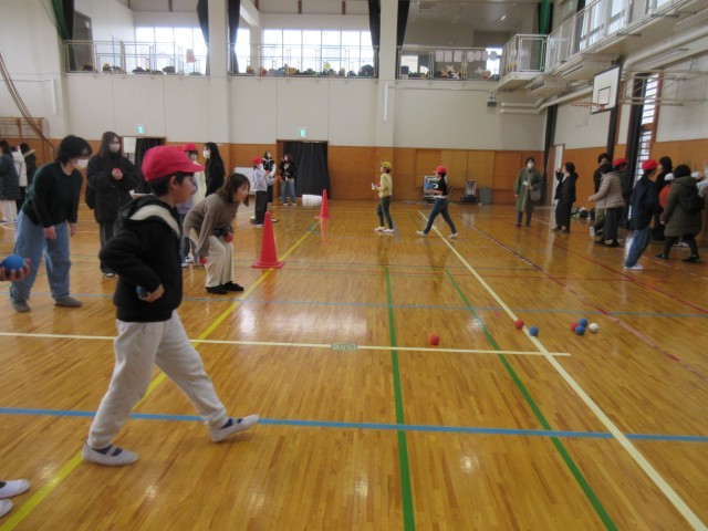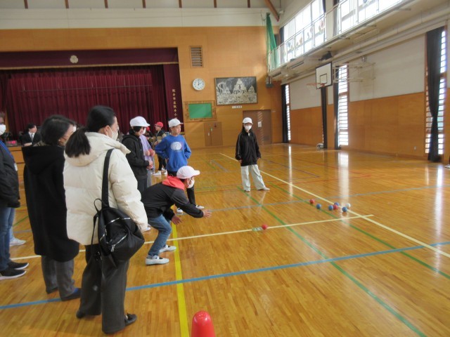 5年生の授業参観は、体育館で行いました。総合的な学習の時間に、福祉をテーマに1年間取り組み、今日はお家の人とボッチャのゲームをしました。お家の人たちの多くはボッチャが初めてだったと思いますが、どのチームも盛り上がり、楽しい時間を過ごすことができました。