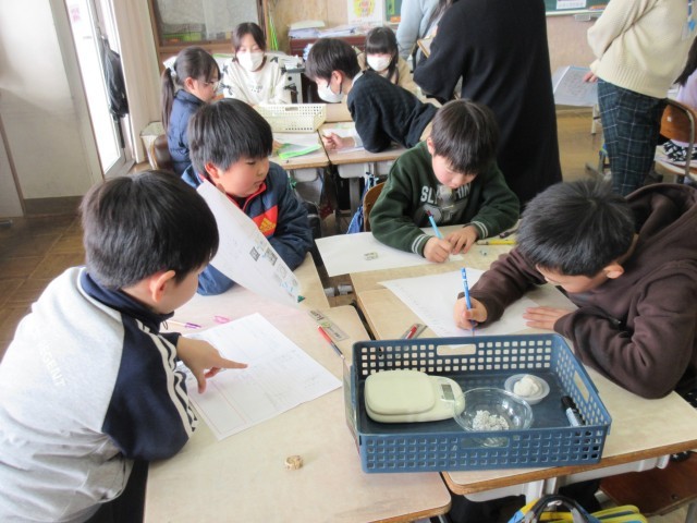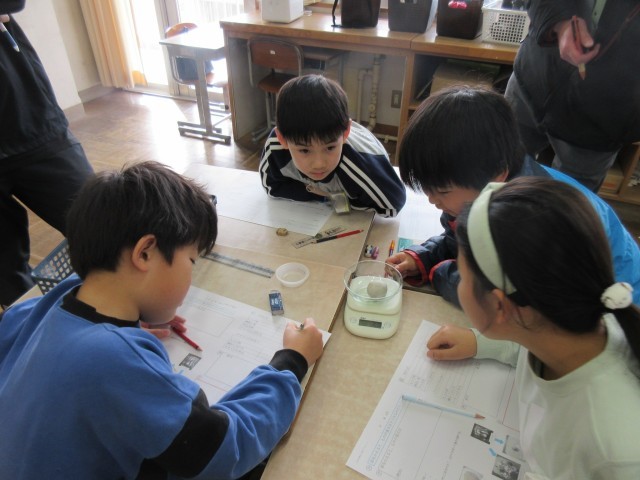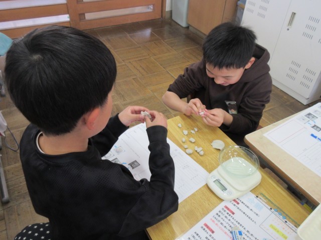 形を変えるとものの重さは変わるのか、実験をしました。ねん土を丸めたものと平らに伸ばしたものや細長くしたもの、1枚のアルミ箔も細かく分けたものをまとめたものと小さく固めたものなど、予想を立てて実験をしました。グループの友達と様々なパターンを試して、結果に納得したり感心したり、楽しく実験できました。