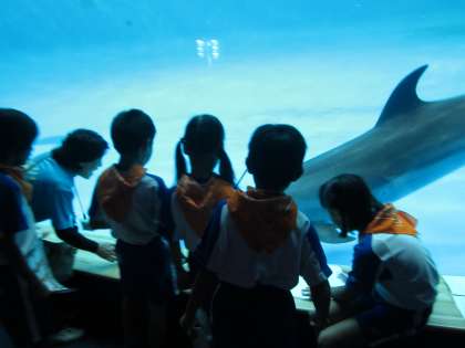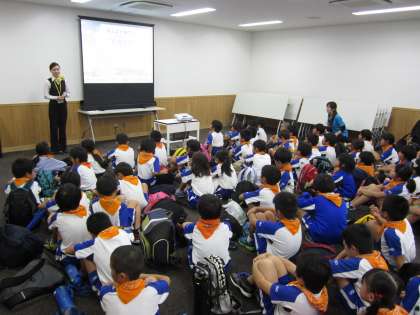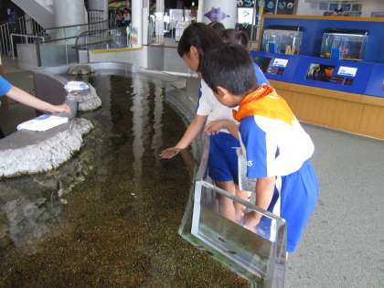 10月1日(火)あいにくの雨だったのですが、元気にアクアワールド大洗水族館と茨城空港見学に行ってきました。水族館では、自分たちの計画をもとにグループ行動をして海にすむ生物の観察をしてきました。体験コーナーでは、水槽の中に手を入れると魚が集まってきて手の角質を食べてくれる「ドクターフィッシュ」が大人気でした。「キャー、魚がいっぱい集まってくる。」「気持ちいいよ!」などおもいおもいの言葉を発していました。茨城空港では、デッキから出発する飛行機を見学し、空港の説明を聞きました。小さいながら便利な面もいろいろわかりました。