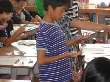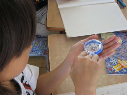 友だちと方角を決め、方位磁針でどちらになるかを調べて練習しました。