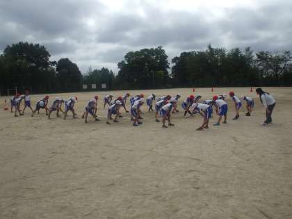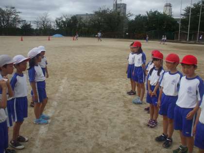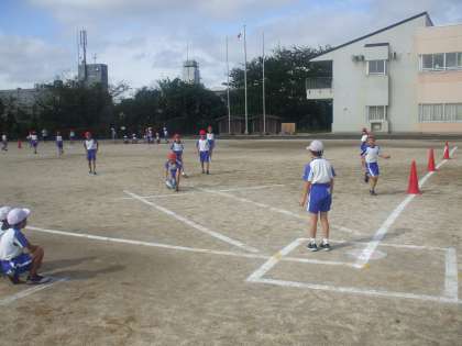 クラスを4チームに分けて、キックベースボールのリーグ戦を行っています。ルールは全員が交代でピッチャーをやり、攻撃でも全員が順番にボールをけってコーンを回ってくるというものです。最初は野球のルールを知っている子が少なかったので、戸惑いがちでしたが、回数を重ねるたびに上手になり、楽しめるようになりました。