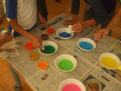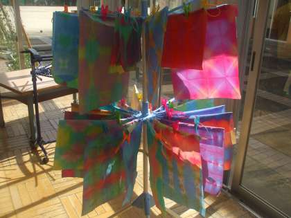 合同学習でつばさ展に向けての作品づくりを行いました。紙を小さく折って何種類かの絵具をしみこませます。紙を開くとすばらしい模様が出来上がります。子どもたちからは「わあきれい!」「こんな模様ができたよ!」夢中で活動していました。