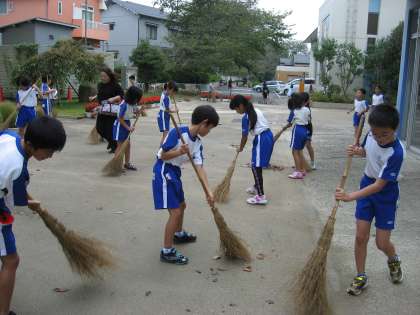 毎朝校舎の周りをお掃除している6年生に代わり4,5年生が進んで掃除に取り組んでいました。