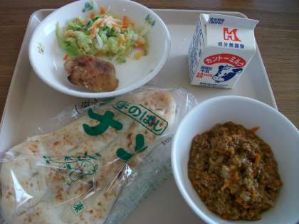 今日の給食 公開日 2013/10/11 更新日 2013/10/11 子どもたちの活動 10月11日(金) (体力みがき) <献立>ナン 牛乳 キーマカレー タンドリーチキン コールスローサラダ 今月の世界の食べ物の旅はインドです。