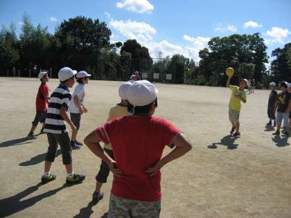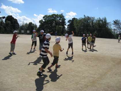 「ボールをとったらすぐに投げよう」「いいプレーがあったらお互いにほめよう」「声をかけ合おう」など先生からのアドバイスもあり,声を出しながらはりきって練習していました。