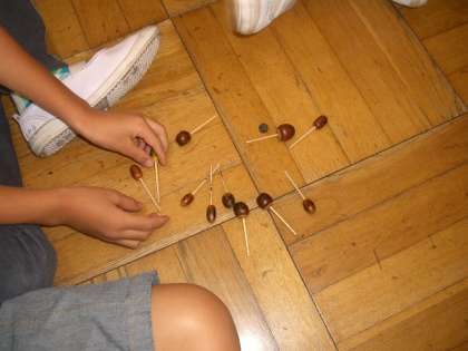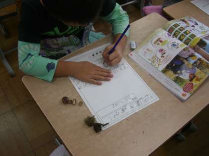 台風が過ぎ去り,先日までの暑さも収まり,めっきり秋らしくなりました。1年生は生活科の時間に,校庭で秋を見つけました。台風の強風でたくさん落ちたドングリや松ぼっくり,ハナミズキの真っ赤な実等,秋をたくさん見つけることができました。絵日記にまとめ,見つけたドングリでコマを作ってみんなで楽しく遊びました。