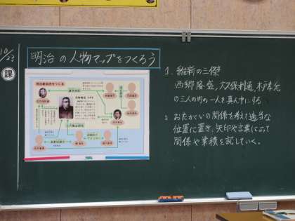 僕は西郷隆盛,私は木戸孝允というように,中心人物を自分で決めて関係図を作りました。また「大日本帝国憲法は誰がつくったんだっけ?」「調べなよー」「ぶみさんだよー」「伊藤博文だ!」などと,学び合いながら進めていました。まさに「学問のすすめ」ですね。