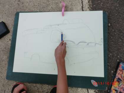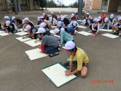 10月22日(火)地域の消防団の方が消防自動車を見せてくださいました。今日は図工で消防自動車を描く日です。本物の消防自動車を前に、子どもたちは目を輝かせて観察していました。複雑な消防自動車を子どもたちはよく見て、その特徴を描いていきました。どんな絵が出来上がるかとても楽しみです。