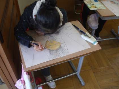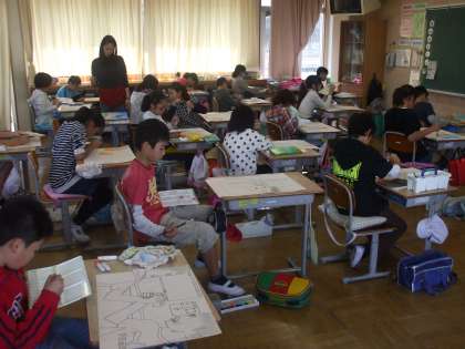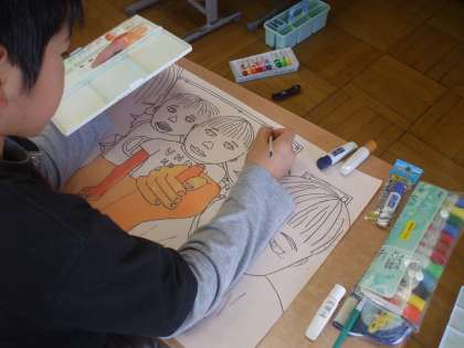 5年生では「腕相撲」「紙飛行機に乗って」という題材で絵を描いています。下絵が終わり、絵具で色をつけ始めました。顔の表情や、構図など着色されてくると作品のよさがますます際立ってきます。どんな作品になるか楽しみです。