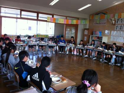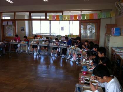 6年生が,いじめ防止に向けて取り組んでいるプロジェクト「給食をひとつの和(輪)で食べよう」を紹介します。リーダーが声をかけて自分たちでひとつの輪をつくり,みんなで給食を食べました。ひとりひとりの顔をみながらの給食は新鮮で,給食をいつも以上においしく感じられました。